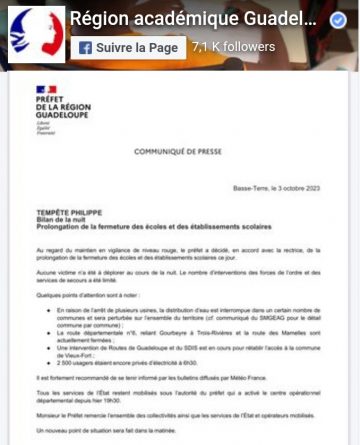 Emis le mardi 03 octobre 2023 à 12h13 légales (soit 16:13 UTC) par le Centre Météorologique de Guadeloupe Fin d’évènement estimée : mercredi 04 octobre 2023 à 17h légales. Situation actuelle A 11h locales, le centre de la Tempête tropicale Philippe se situait à environ 90 km Ouest de Saint-Martin.