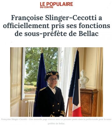 Originaire de la Guadeloupe, plus précisément de la région basse-terrienne, Francoise Slinger-Cecotti vient de prendre ses fonctions de Sous-préfète à Bellac dans la Haute-Vienne. Anne-Marie Muia dans le Populaire du Centre lui consacre un article. Titulaire d’un DESS de Droit à Paris XI Jean Monnet, Francoise Slinger-Cecotti a été notamment