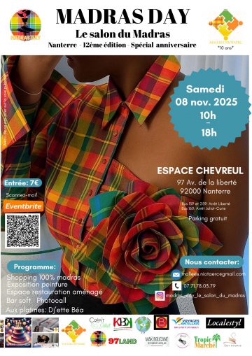 Madras : le tissu qui tisse la liberté De l’Inde coloniale aux podiums européennes, le madras raconte une histoire de résistance, de style et de fierté. La 12ᵉ édition du Salon du Madras à Nanterre, le 8 novembre 2025. 97 av de la Liberté de 10 h à 18 h.