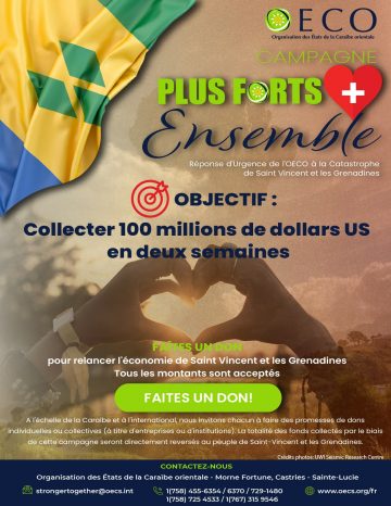 L’OECS lance une campagne d’appel aux dons L’Organisation des Etats de la Caraïbe de l’Est (OECS) réaffirme sa solidarité envers un de ses membres fondateurs durement affecté suite aux éruptions du volcan la Soufrière : Saint-Vincent et les Grenadines. Après la mobilisation de tous les membres pour coordonner par territoire, l’acheminement de