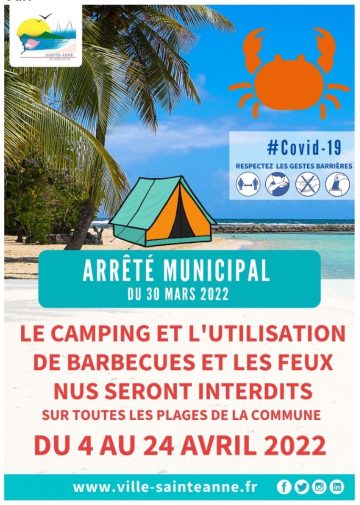Dans le contexte actuel, la Ville de Sainte-Anne Guadeloupe informe la population que le camping et l’utilisation de barbecues et de feux nus seront strictement interdits sur les plages de la commune du lundi 4 au dimanche 24 avril 2022 inclus. Ces mesures de prudence sont également prises pour préserver le littoral.