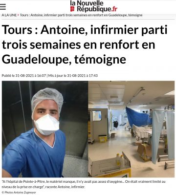 Antoine Zugmeyer, infirmier tourangeau, a passé trois semaines au CHU de Pointe-à-Pitre. Des extraits de son témoignage dans la Nouvelle République. … « On m’a proposé la mission la veille, je n’ai eu que quelques minutes pour donner une réponse… En pédiatrie, je n’ai pas souffert du Covid comme mes collègues