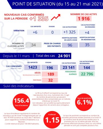 Coronavirus Covid-19 à La Réunion : La situation sanitaire se dégrade cette semaine : les gestes barrières et les protocoles sanitaires doivent absolument être respectés ! Une remobilisation est plus que jamais nécessaire. Les chiffres des 7 derniers jours montrent une augmentation importante du nombre de cas avec un taux d’incidence