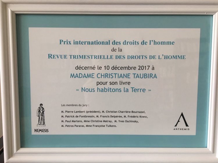 En décembre 2017, un jury composé de hautes personnalités belges et françaises a décerné le Prix international des Droits de l’Homme de la Revue trimestrielle des droits de l’homme à Christiane Taubira, pour son livre « Nous habitons la terre » dans lequel elle s’indigne des inégalités et des violences qui règnent sur notre planète.