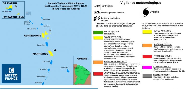 Le scénario le plus probable est maintenant un passage du cœur du phénomène, zone la plus intense, à proximité immédiate des Iles du Nord dans la journée de mercredi. Les vigilances cycloniques ont été déclenchées dimanche matin pour les Iles du Nord et la Guadeloupe. Toutes les informations concernant ces territoires sont disponibles dans les bulletins de suivi et seront réactualisées régulièrement.