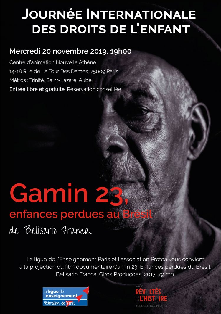 Dans le cadre de la journée de la conscience noire au Brésil et de la journée internationale des droits de l’enfant, la ligue de l’Enseignement Paris et l’association Protea vous convient à la projection du film documentaire « Gamin 23, Enfances perdues du Brésil », de Belisario Franca.