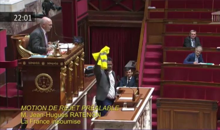 Jean-Hugues Ratenon député (LFI) de la Réunion, brandit un gilet jaune dans l’Assemblée nationale provoquant une suspension de séance. A noter que le micro lui a été coupé.
