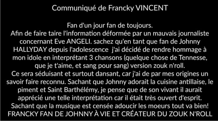 Eve Angeli ayant renoncé, Francky Vincent a décidé de reprendre Johnny en version Zouk. Nous le soutenons dans sa démarche, pour la liberté d’expression de tous ceux qui viennent d’au-delà de l’hexagone.