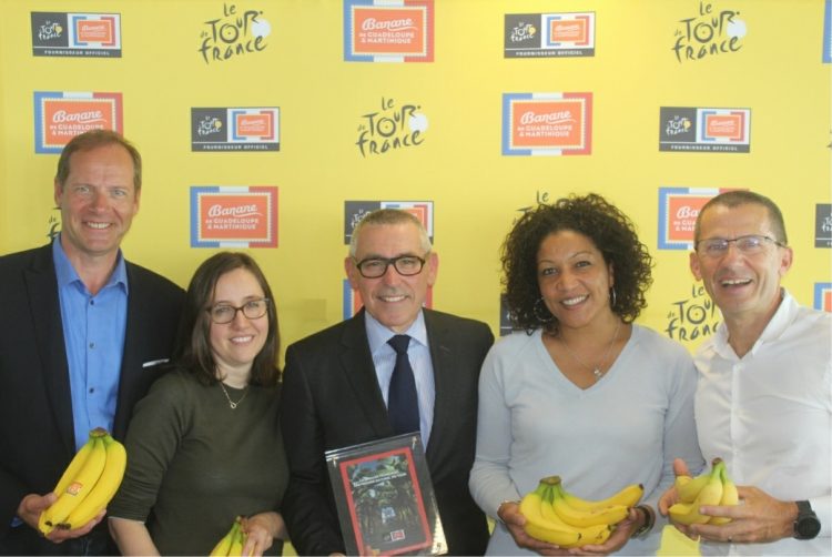 De gauche à droite : Christian Prudhomme (Directeur du Tour de France), Audrey Ktourza (Chef de Groupe Marketing), Philippe Ruelle (Directeur Général de la Banane Française), Géraldine Mbarga Mboa (Responsable des Relations Publiques) et Yann Le Moenner (Directeur Général d’A.S.O.)