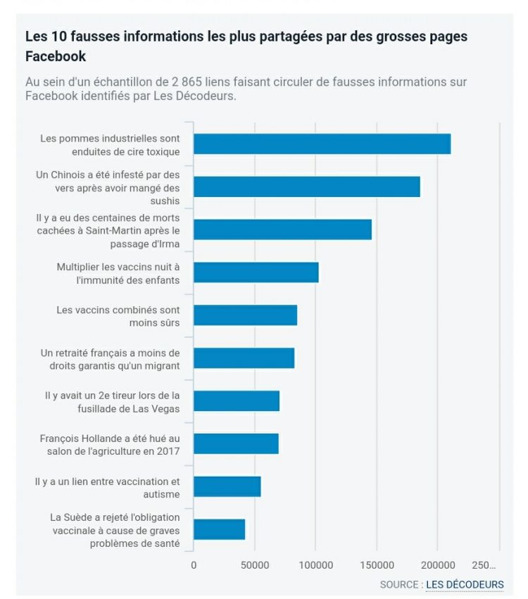 Dans un article du 19 decembre, Adrien Senecat revient sur les 10 rumeurs infondées, ces messages partagés des millions de fois. « Les quatre fausses informations les plus populaires de cet échantillon ont été relayées plus de 100 000 fois à partir de ces seules publications sur Facebook, un niveau d’audience que peu d’articles de médias traditionnels en ligne arrivent à atteindre ».
