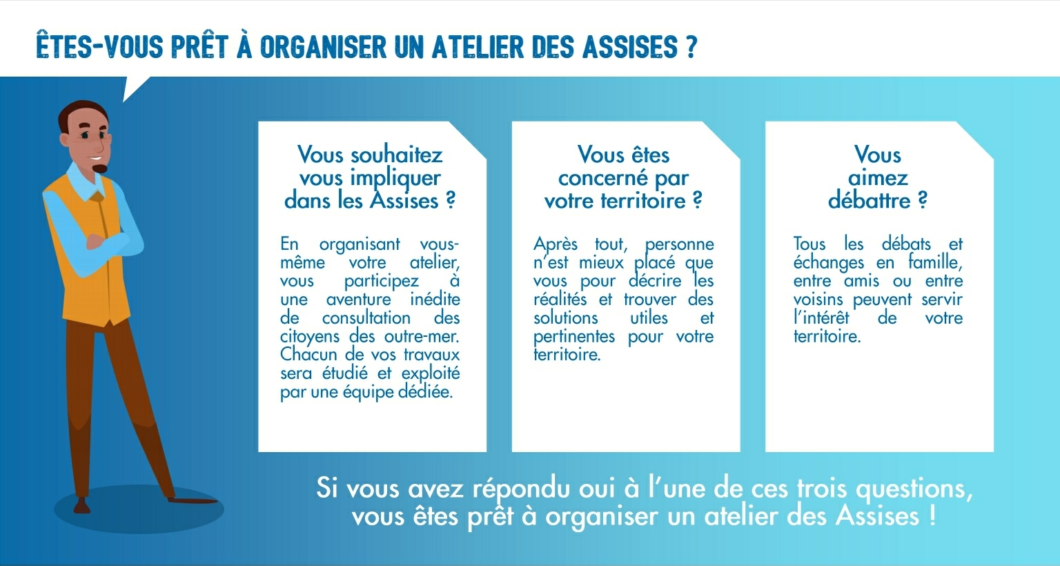 « En plus d’être un guide facile à prendre en main, ce mode d’emploi permet de rappeler que les Assises appartiennent à chaque citoyen concerné par l’avenir de son territoire », précise Annick Girardin, ministre des outre-mer. «À ce stade, nous demandons à ceux qui le souhaitent d’apporter une contribution, d’émettre des idées, de prendre la parole. Cette étape est fondamentale pour la réussite des Assises. »